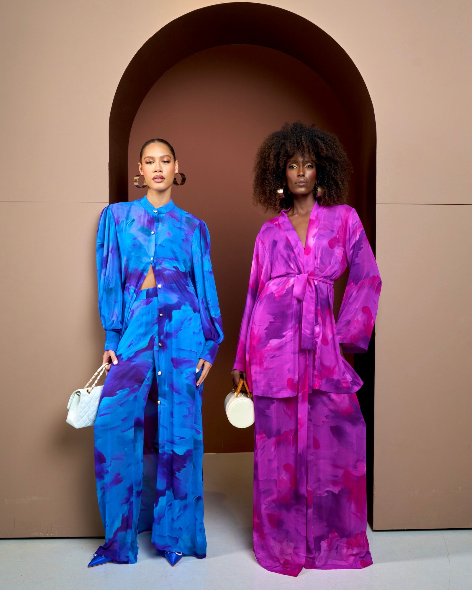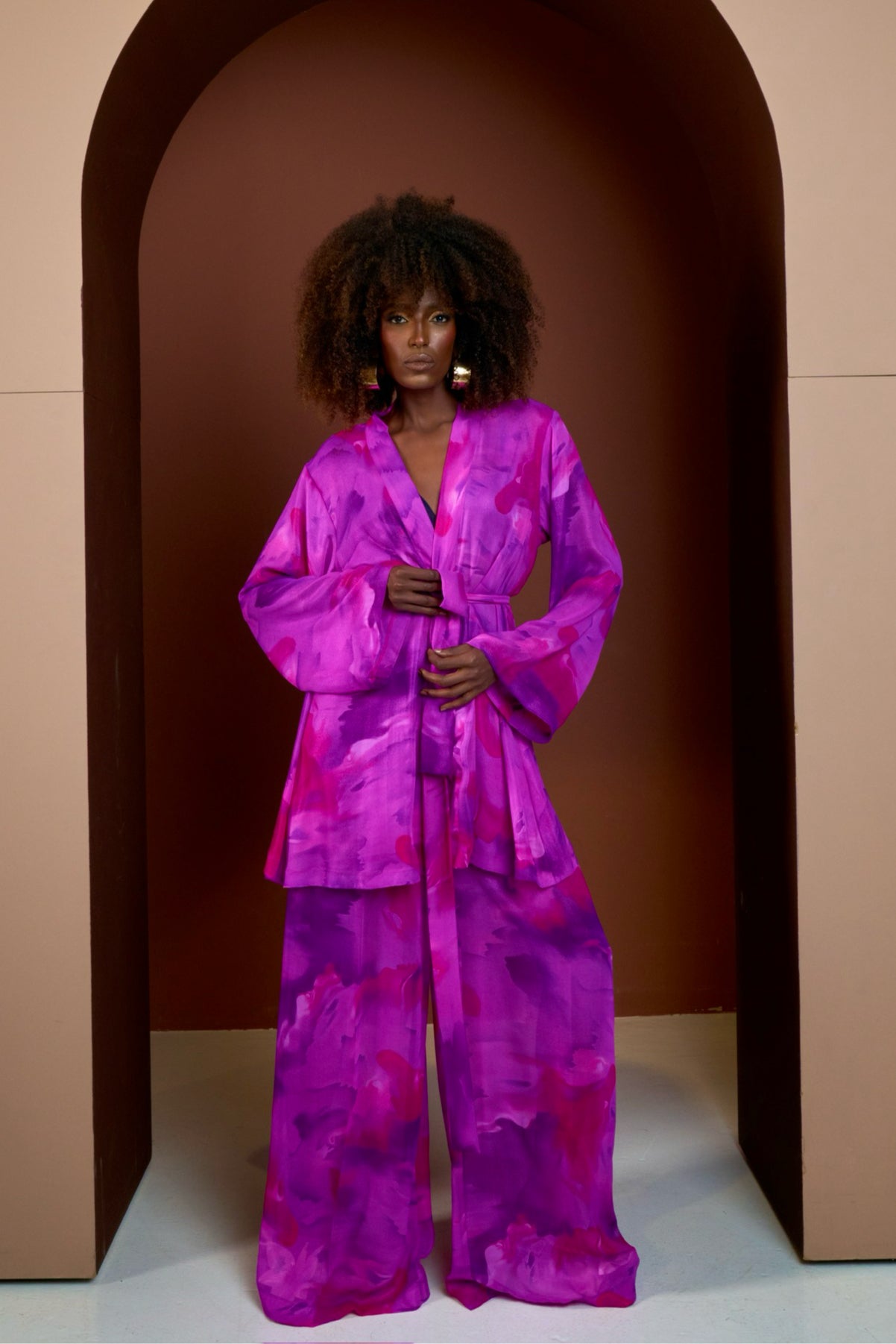 Effortlessly elegant, the Purple Aurora Kimono & Pants set is a statement in movement and color. The long sleeve kimono drapes beautifully, featuring a bold blend of purple and pink that captures the essence of vibrant energy. Paired with matching pants and a belt that snatches the waist, this set flows with every step, offering both comfort and sophistication. Whether styled for a breezy day out or an elevated evening look— Aurora is a celebration of bold femininity and effortless grace.