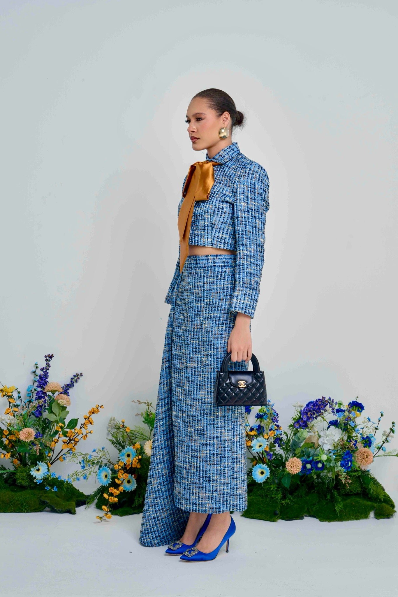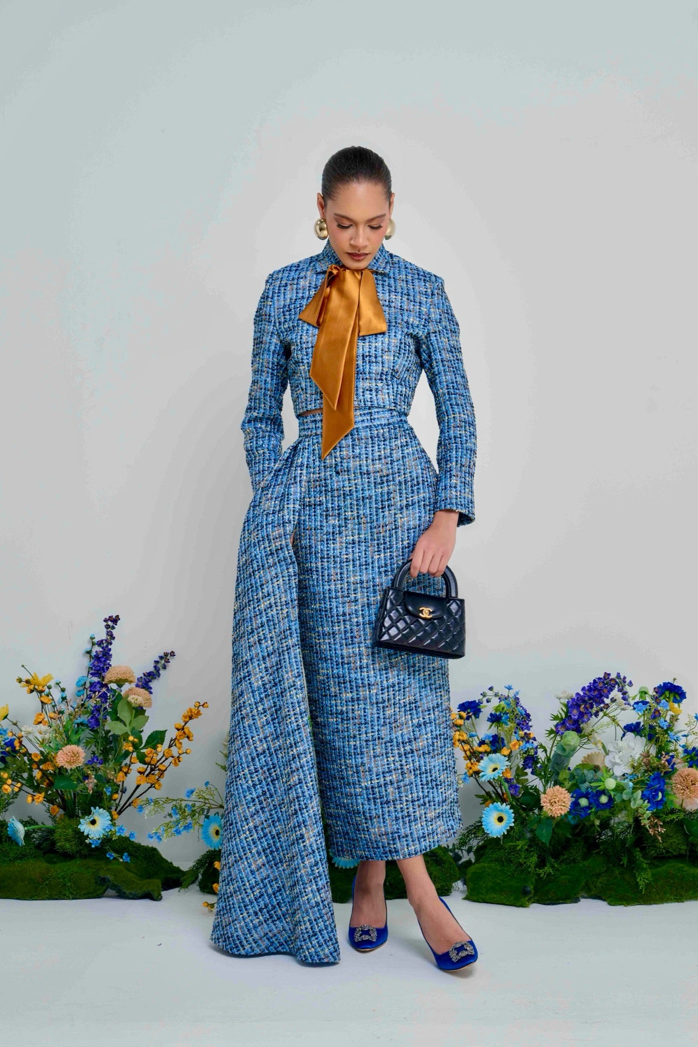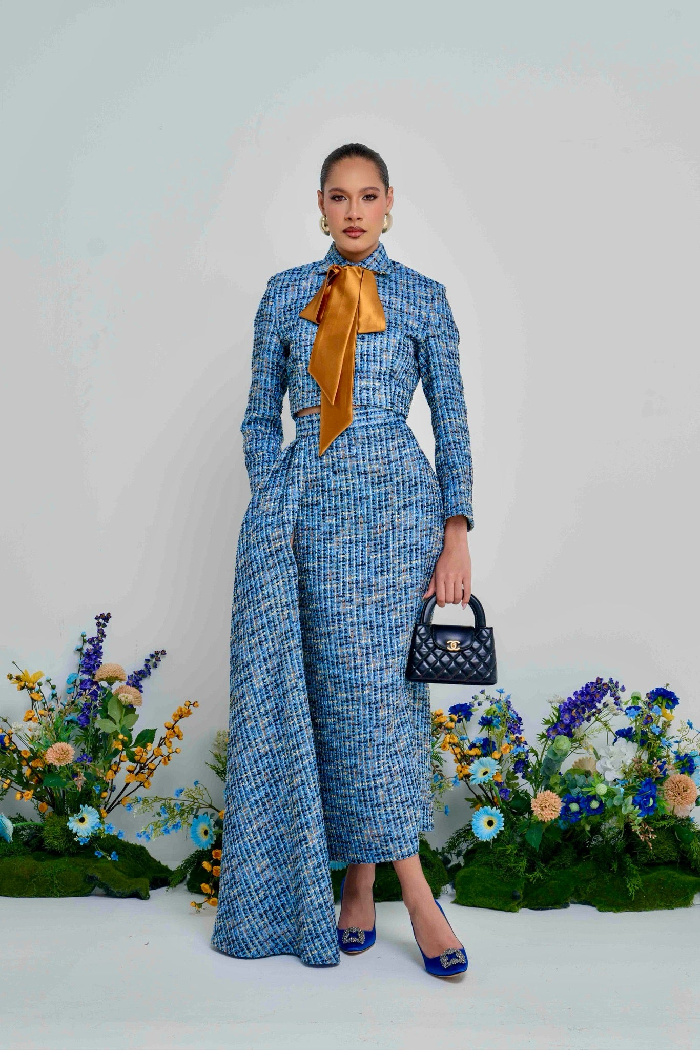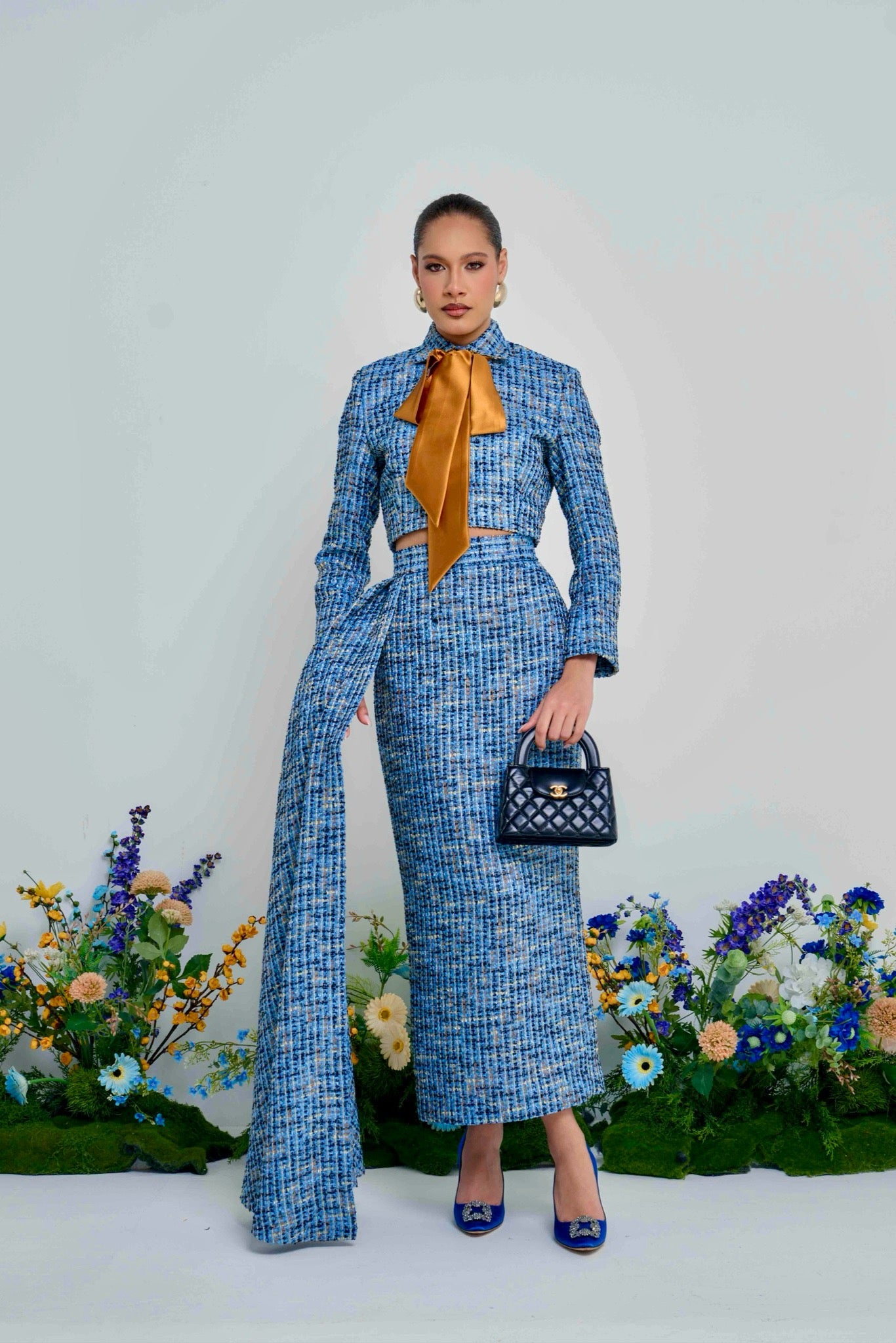 Meet The Ola Blazer: a polished blue tweed cropped blazer designed for elegant, modern dressing. Finished with a luxe gold belt/neck tie, it instantly elevates your look from day to night.