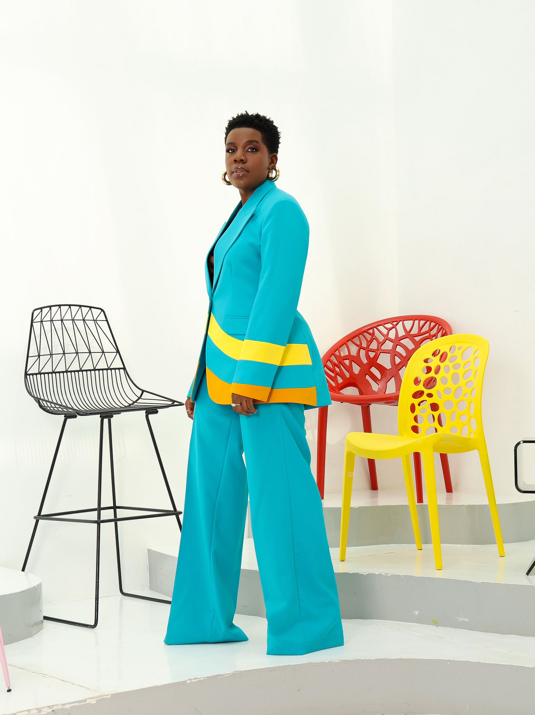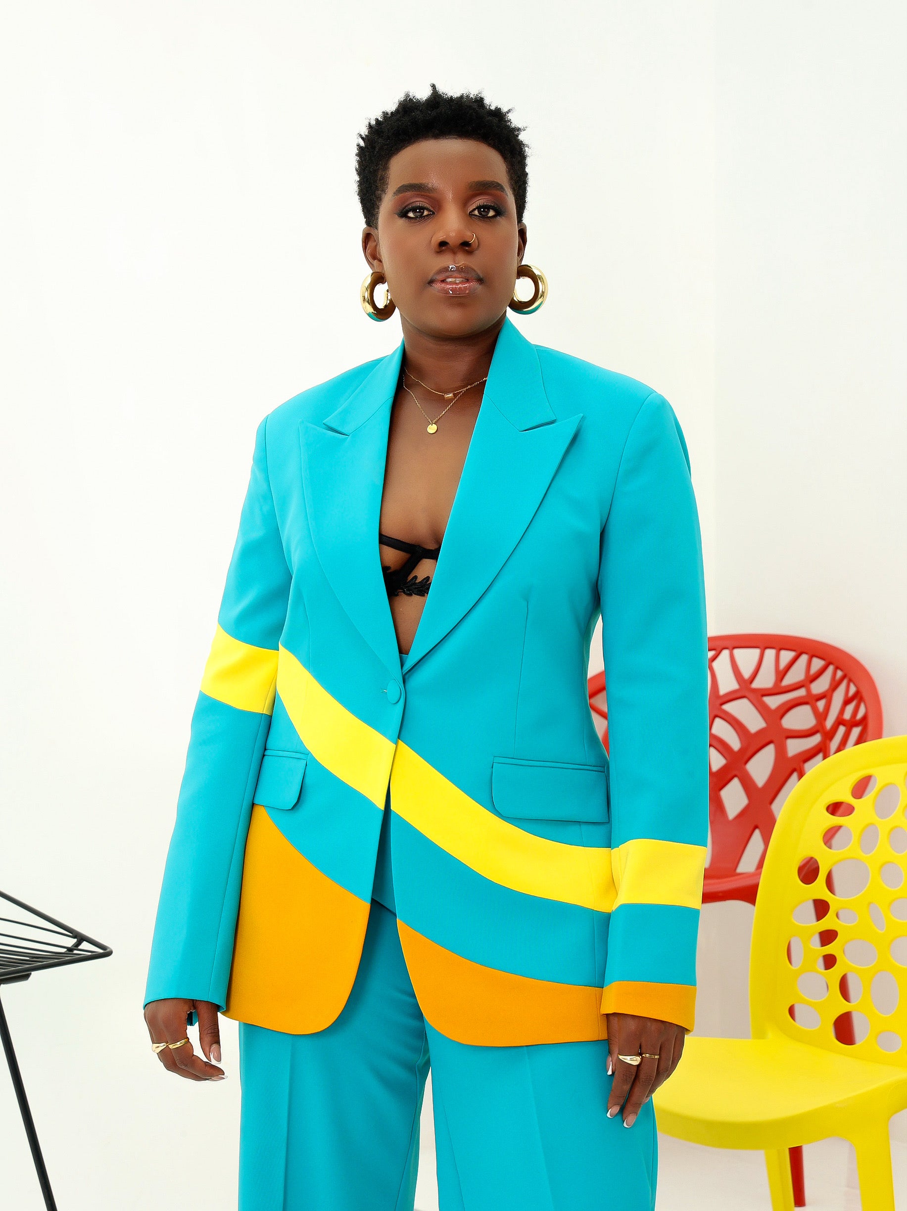 The Annakat Blazer showcases a sophisticated interplay of vibrant color bursts, meticulously designed to highlight its detailed symmetry. Expertly tailored, this blazer combines bold aesthetics with refined structure, offering a statement piece that elevates any ensemble with precision and elegance.
