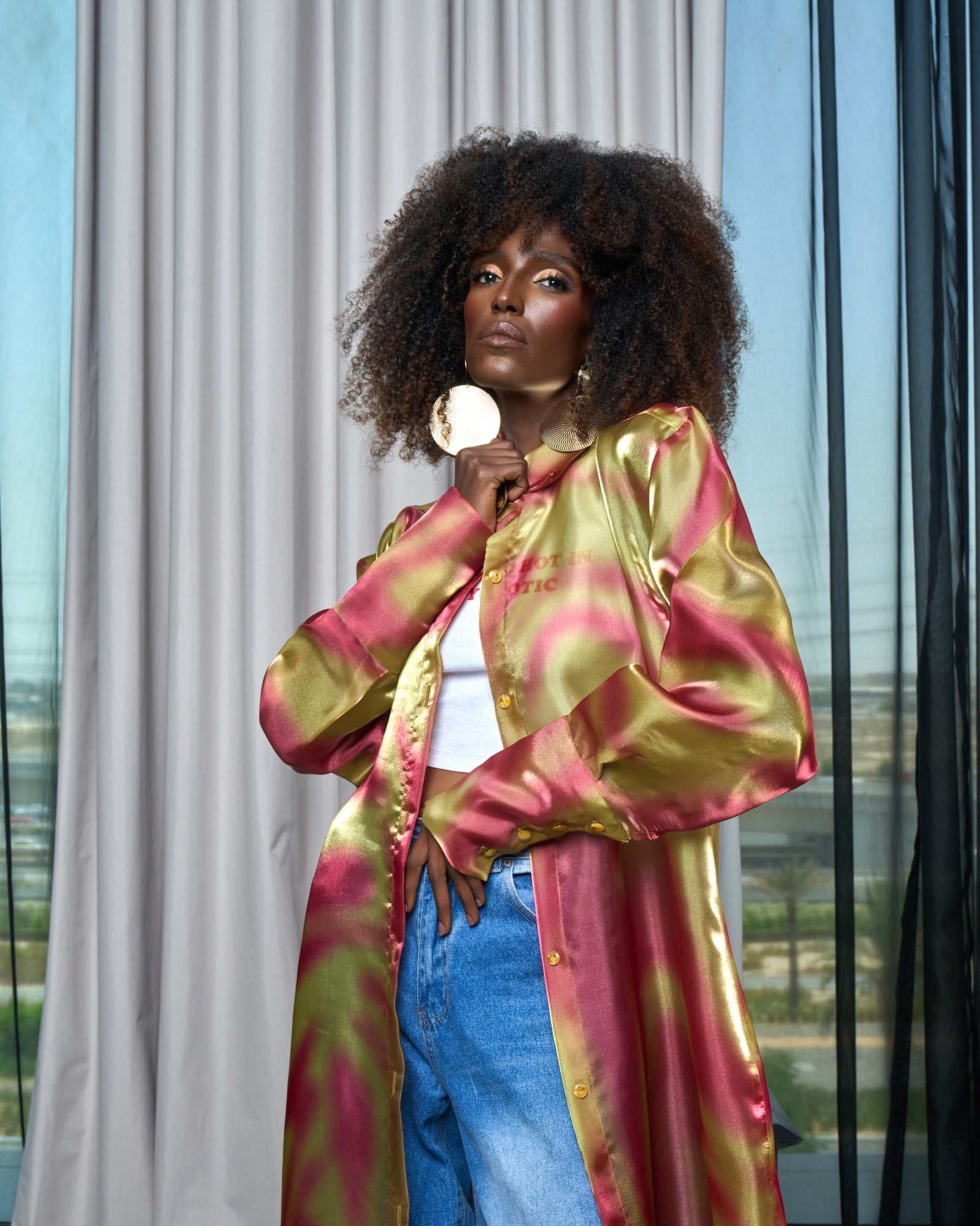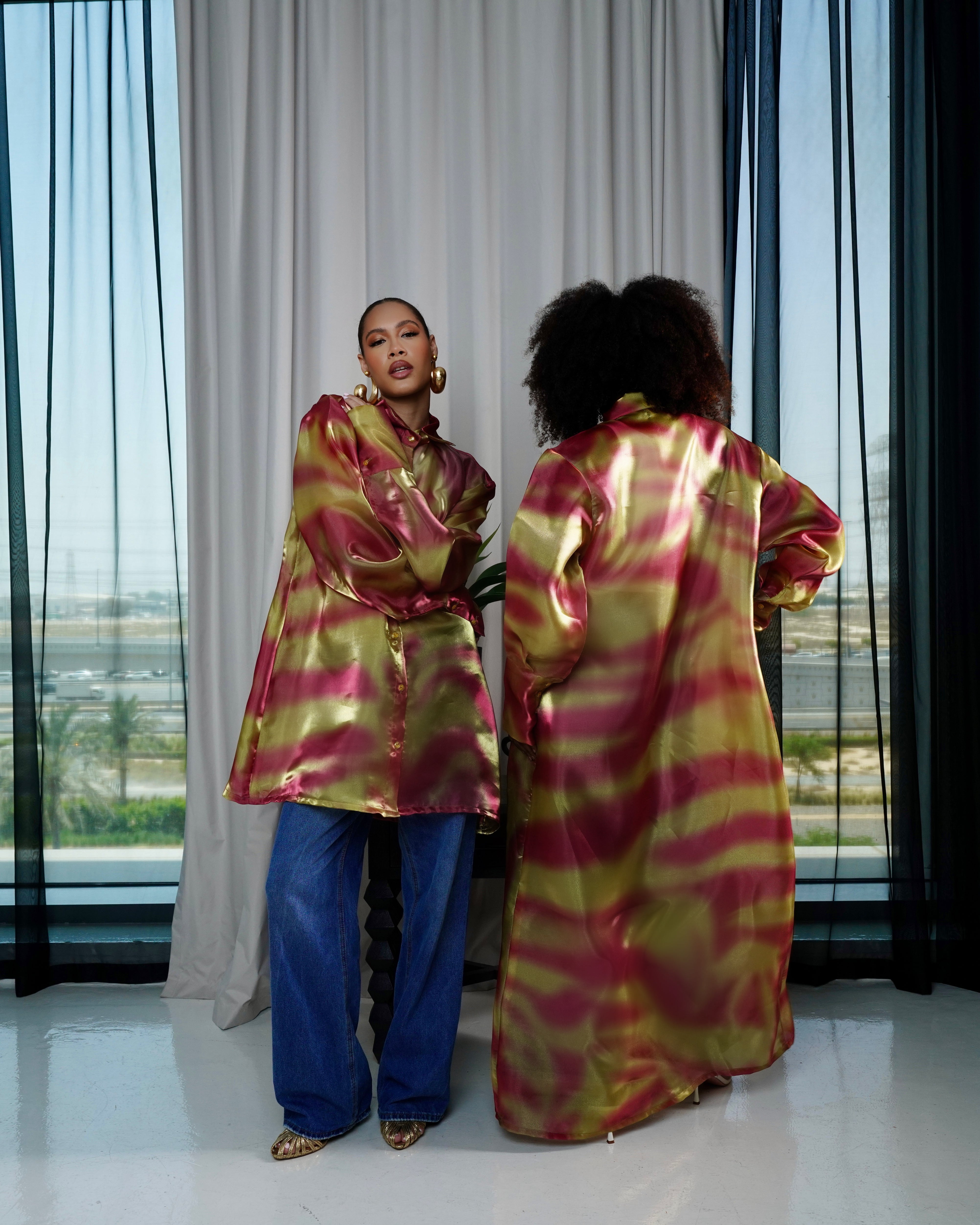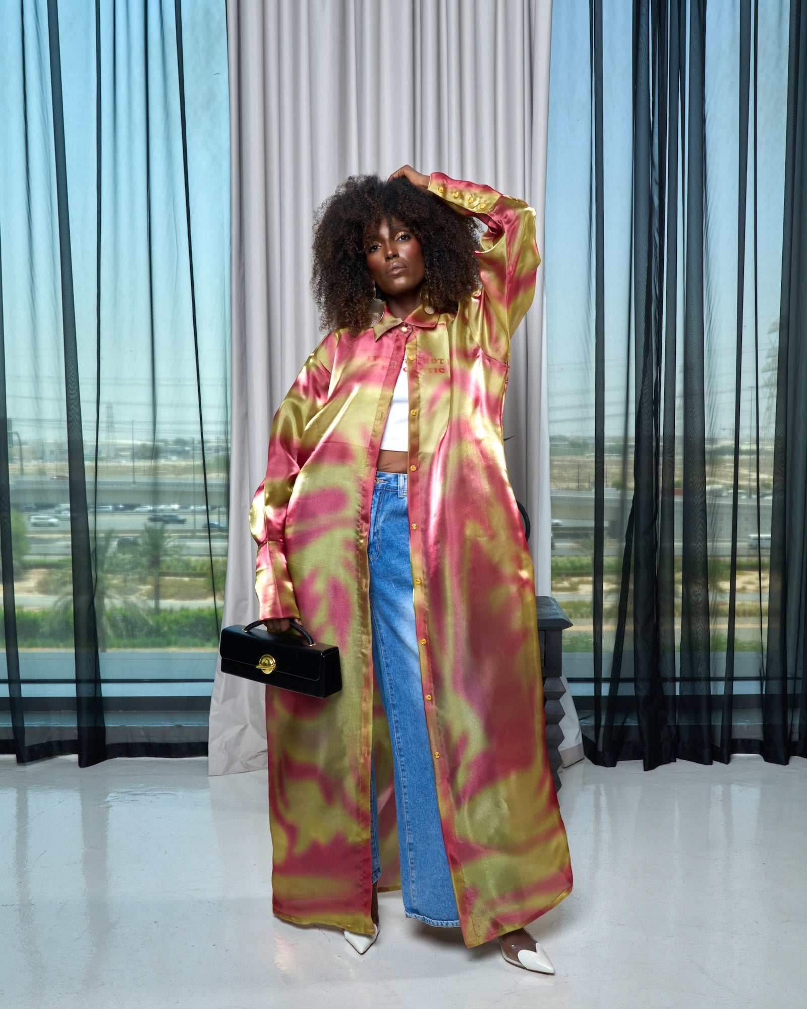 The Khalil Shirt Dress is a stunning fusion of sheer elegance and vibrant chrome. Featuring a breezy, shirt dress adorned with bold colors, this statement piece is perfect for that special occasion. The lightweight fabric drapes effortlessly, while the longline design and relaxed fit add a touch of effortless sophistication. Wear it open for a flowy, ethereal effect or buttoned up for a chic, structured look. Whether paired with denim or worn as a standalone dress, it’s the ultimate expression of modern femininity.