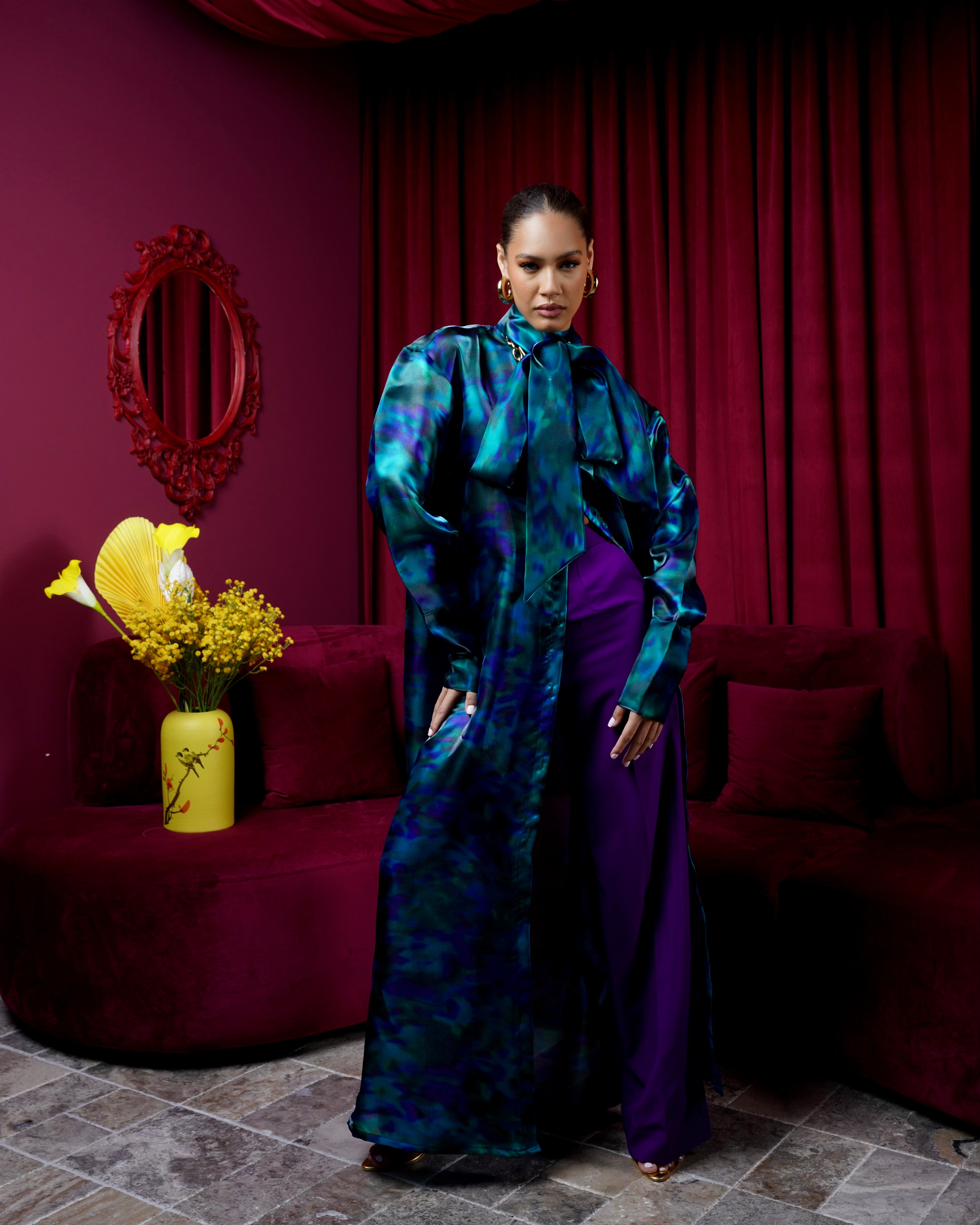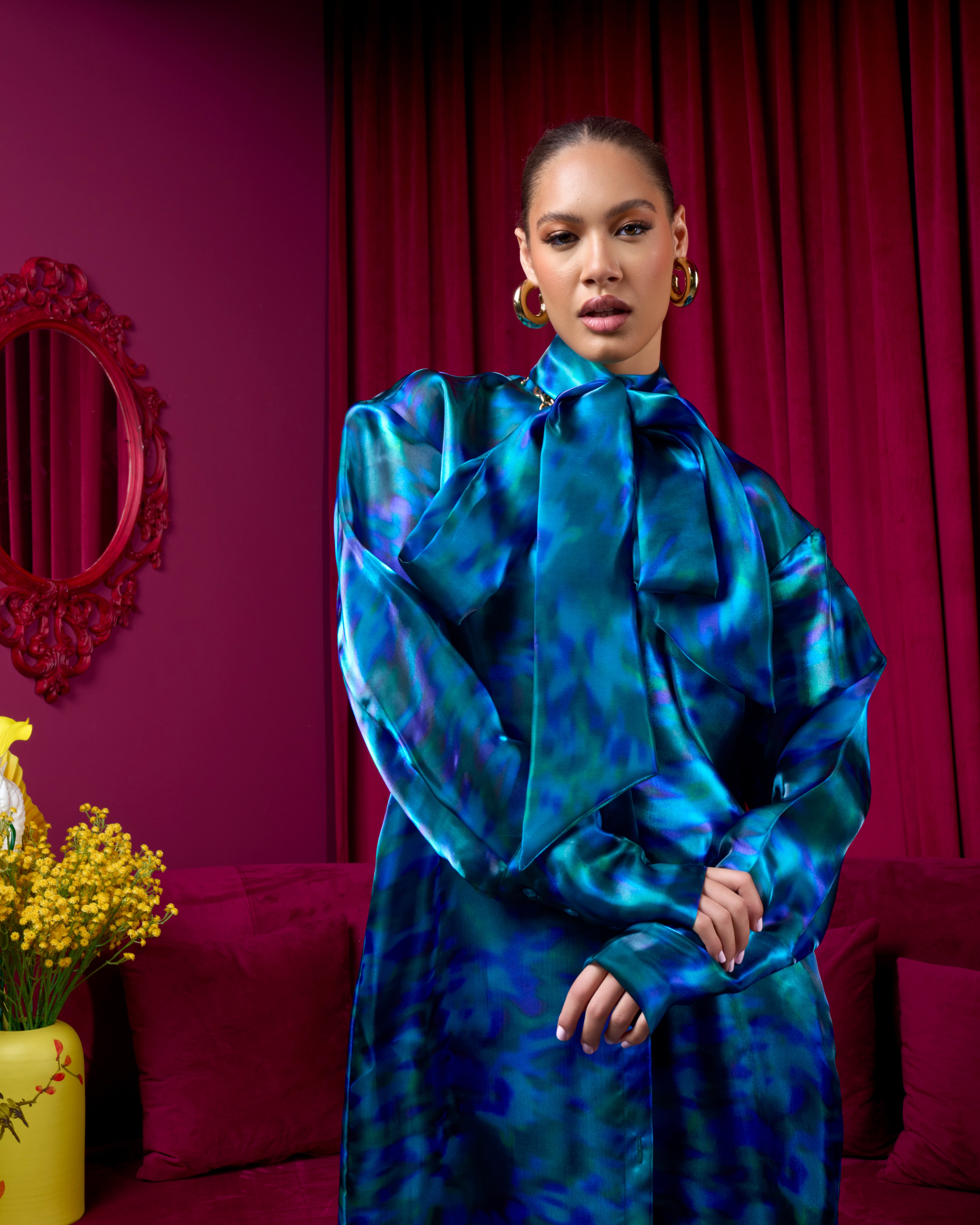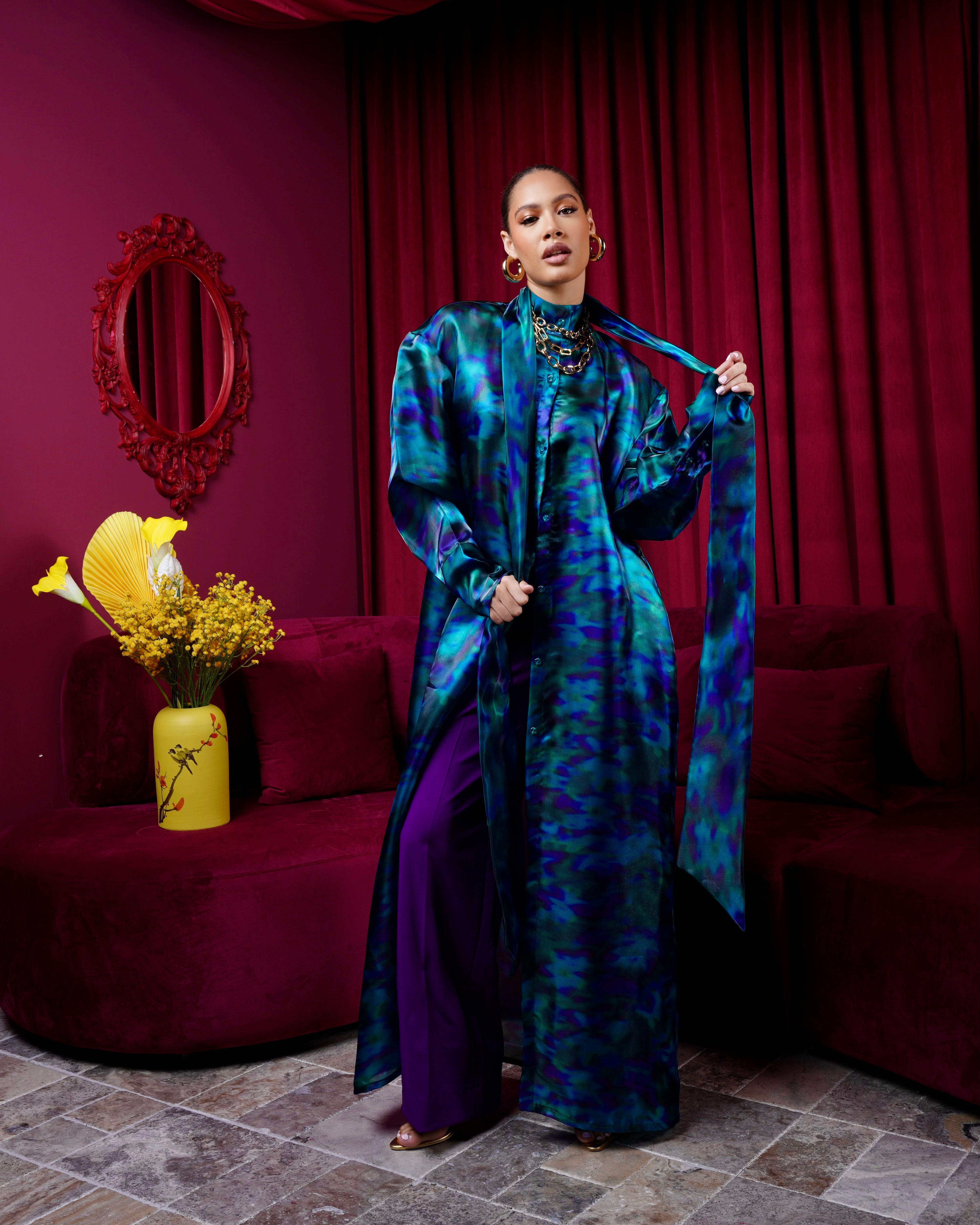 With its striking print and soft flow, the Sasha Shirtdress moves with quiet confidence. The exaggerated bow adds a playful touch to its polished silhouette, while the rich jewel tones speak volumes—without saying a word. Wear it as a dress or layer it over the Lily Purple Pants for a modern twist on timeless style.