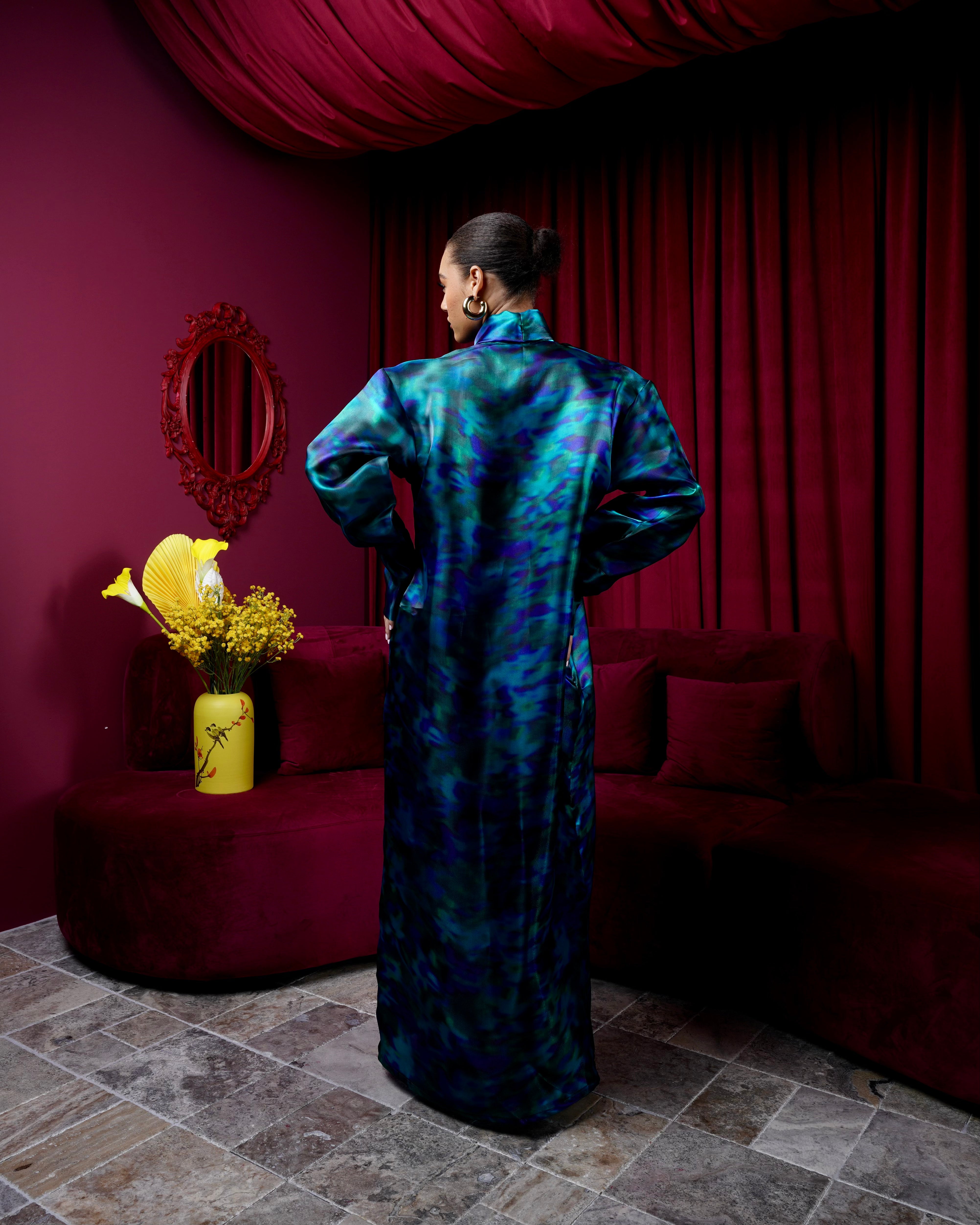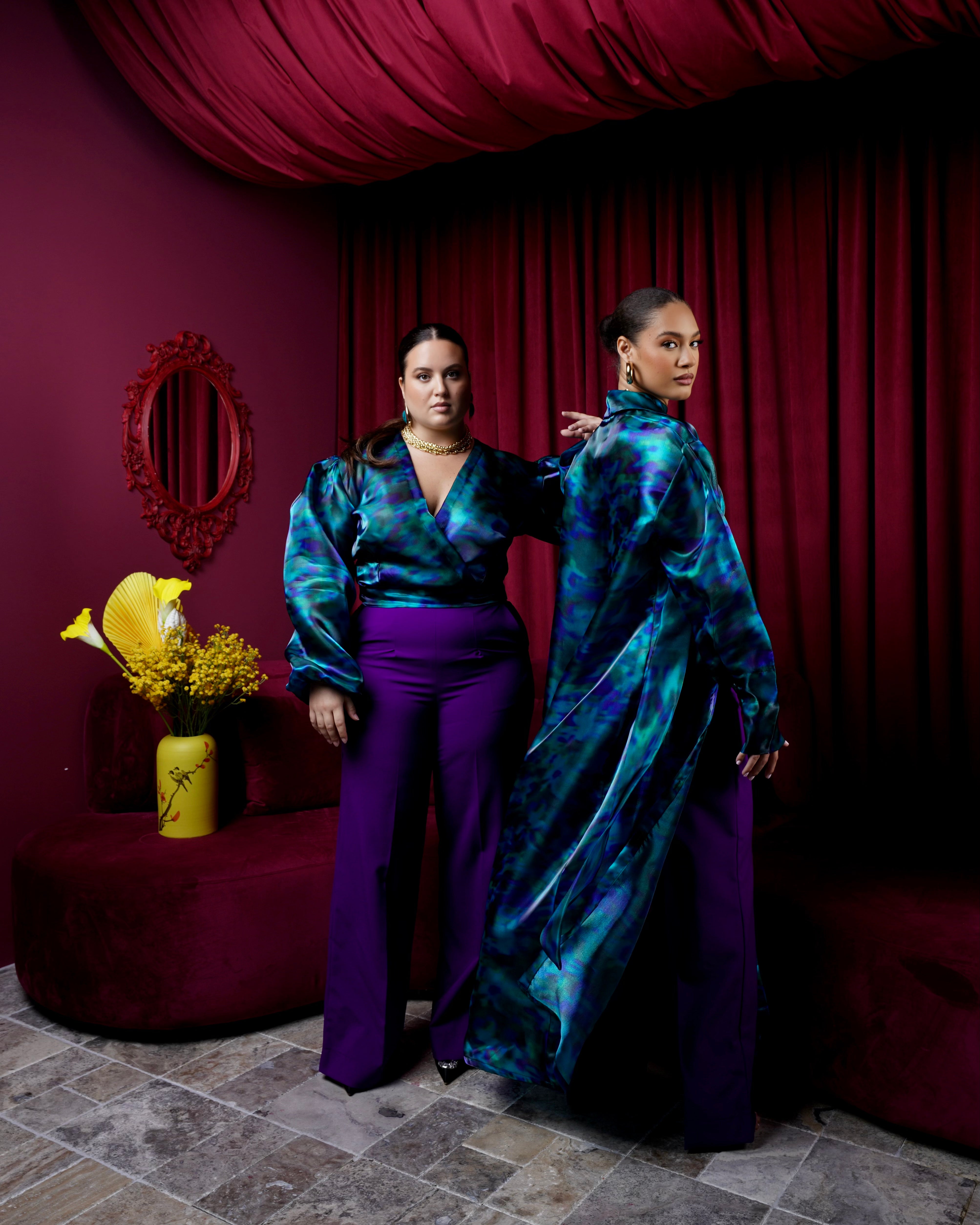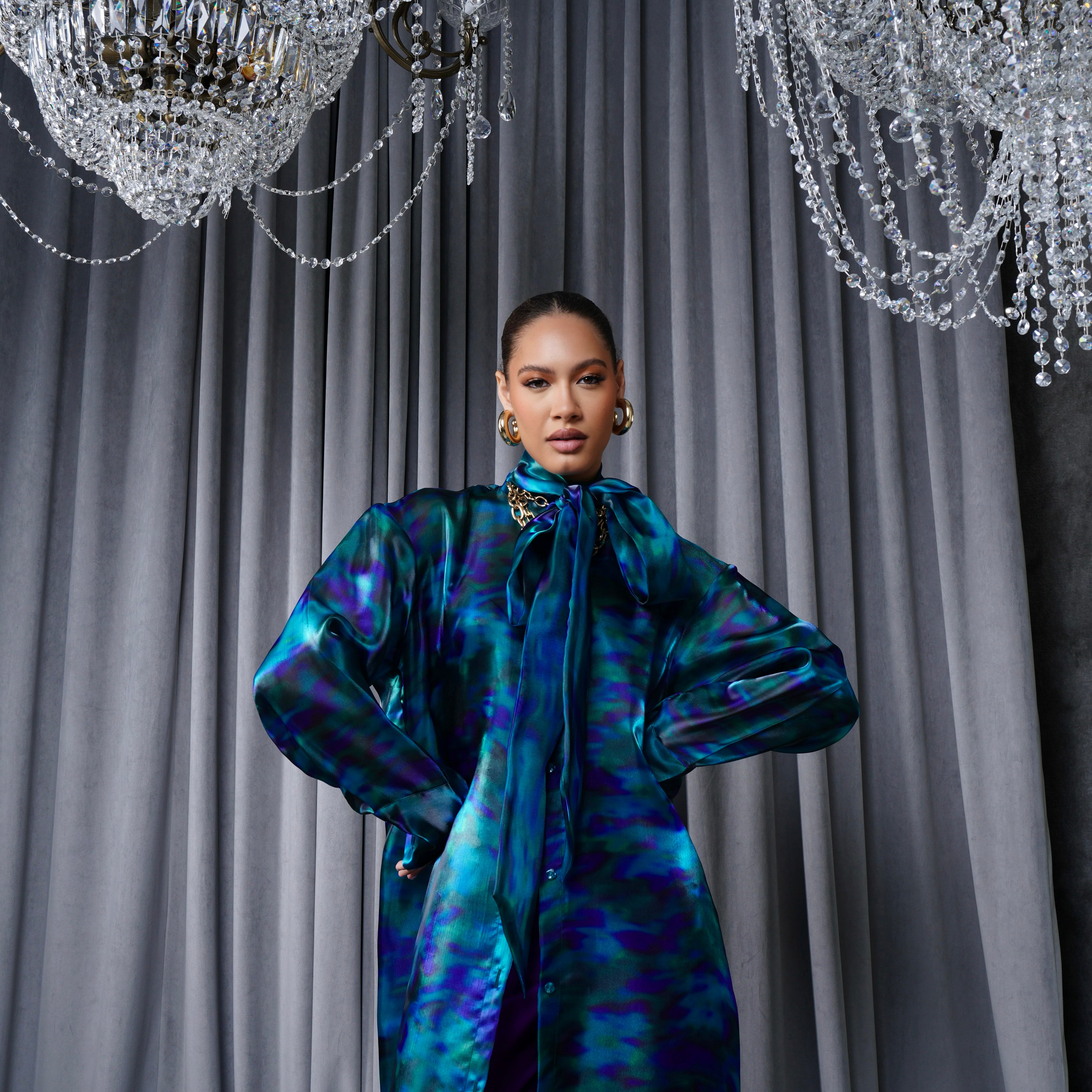 With its striking print and soft flow, the Sasha Shirtdress moves with quiet confidence. The exaggerated bow adds a playful touch to its polished silhouette, while the rich jewel tones speak volumes—without saying a word. Wear it as a dress or layer it over the Lily Purple Pants for a modern twist on timeless style.